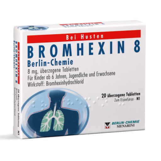 Bromhexin 8 Berlin-Chemie überzogene Tabletten sind ein Hustenmittel zur schleimlösenden Behandlung bei akuten und chronischen Erkrankungen der Bronchien und der Lunge mit zähem Schleim. Geeignet für Kinder ab 6 Jahren und Erwachsene.