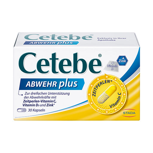 Nahrungsergänzungsmittel mit Vitamin C, Zink und Vitamin D3. Cetebe® ABWEHR plus unterstützt mit Hilfe der wichtigen Nährstoffe Vitamin C, Vitamin D und Zink die Abwehrkräfte und trägt zu einer normalen Funktion des Immunsystems bei.** Vitamin C, Vitamin D und Zink sind an unterschiedlichen Prozessen im Immunsystem beteiligt.