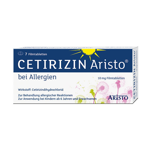 Cetirizin Aristo® bei Allergien ist ein rezeptfreies Antiallergikum mit dem Wirkstoff Cetirizindihydrochlorid. Es wird bei Kindern ab einem Alter von 6 Jahren und Erwachsenen zur Linderung von Nasen- und Augensymptomen bei saisonaler und ganzjähriger allergischen Erkrankungen wie allergischem Schnupfen (Rhinitis) und Nesselsucht (Urtikaria) eingesetzt.
