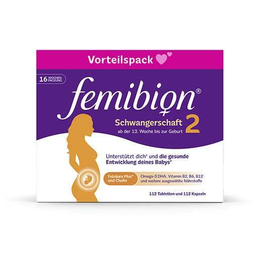 Femibion® 2 Schwangerschaft ist speziell auf den besonderen Bedarf von Ihnen und Ihrem Baby in dieser Phase abgestimmt.* Neben Folat (Folsäure und Metafolin®) enthält Femibion® 2 Schwangerschaft Eisen und DHA. Eisen trägt zur normalen Bildung von roten Blutkörperchen und Hämoglobin sowie zur Verringerung von Müdigkeit und Ermüdung bei.