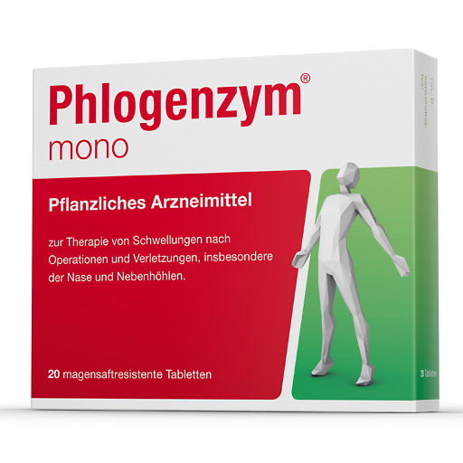 Phlogenzym mono ist ein pflanzliches Arzneimittel, welches bei Schwellungen nach Operationen oder Verletzungen eingesetzt wird. Der in Phlogenzym mono enthaltene Wirkstoff Bromelain wirkt dabei von innen heraus abschwellend. Phlogenzym mono ist sehr gut verträglich und sanft zu den Schleimhäuten.