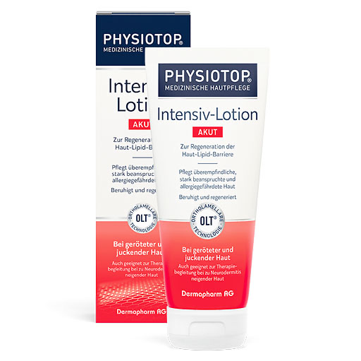 Physiotop® Akut Intensiv-Lotion mit ihrer auf die Bedürfnisse juckender, geröteter und stark beanspruchter Haut abgestimmten Rezeptur regeneriert durch die innovative OLT®-Technologie die natürliche Haut-Lipid-Barriere und versorgt die Haut sowohl mit Feuchtigkeit (u. a. durch Glycerin und den essentiellen Aminosäuren Glycin und Serin) als auch mit juckreizlindernden und beruhigenden Inhaltsstoffen wie Weihrauch oder Avenanthramide, den aktiven, natürlichen Bestandteilen von Hafer. Physiotop® Akut Intensiv-Lotion eignet sich daher ideal für die Akut-Pflege sowie zur therapiebegleitenden Pflege bei Neurodermitis – insbesondere für größere Hautpartien wie Oberkörper, Arme und Beine.