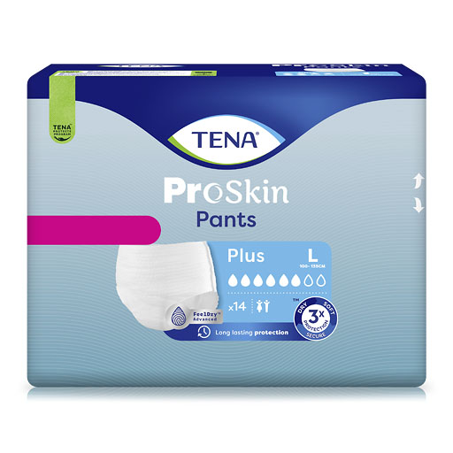 TENA® ProSkin Pants Plus sind für Menschen mit mittelschwerer Blasenschwäche bzw. Inkontinenz geeignet. Die weichen Einweg-Slips mit körpernaher, bequemer Passform bieten zuverlässigen Dreifach-Schutz vor Auslaufen, Gerüchen und Feuchtigkeit.